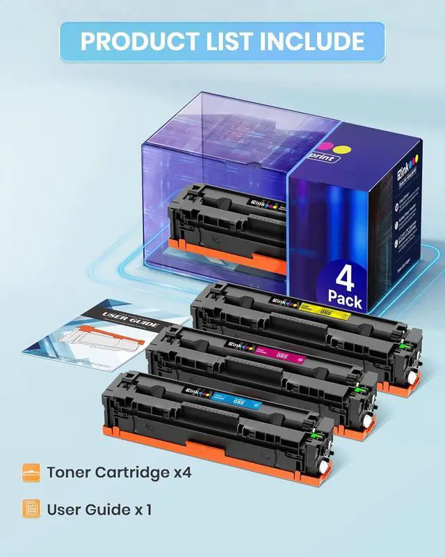 Package Contents: 1 x User Guide, 1 x 055 Black, 1 x 055 Cyan, 1 x 055 Magenta, 1 x 055 Yellow (Total 4 Pack) to use with canon mf743cdw toner cartridges
