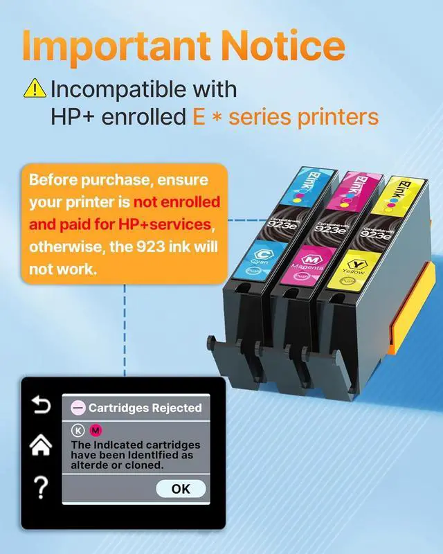*Incompatible with HP+ enrolled E*series printers: Activation of HP+ service will cause the printer to reject E-Z Ink for hp 923 ink cartridges combo pack.