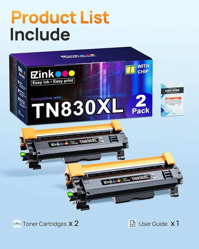 Package Contents: Includes 2 x TN830XL/TN830 toner cartridges for Brother printers and 1 x user guide.