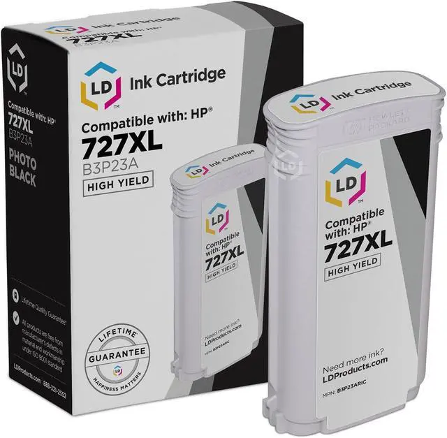 Save and print even more when you shop with LD Products! This offer includes (1) B3P23A / HP 727XL High Yield Photo Black ink cartridge. Why pay more for expensive brand name Hewlett Packard ink? This ink cartridge is compatible with HP DesignJet T1500, T2500, T2530ps, T920, T930 and T930 36-in printers. Please note, retail packaging may vary and this ink cartridge will only work with printers purchased within the United States and Canada. The use of remanufactured replacement printing supplies does not void your printer warranty. HP does not remanufacture our remanufactured ink cartridges.
