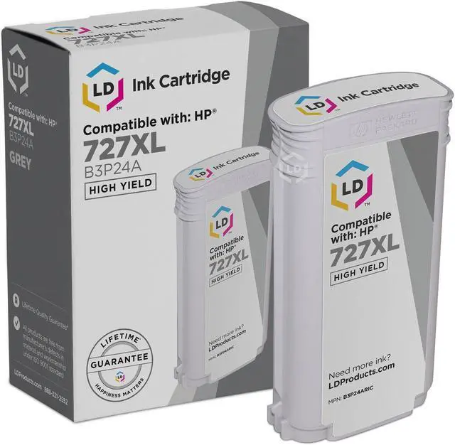 Save and print even more when you shop with LD Products! This offer includes (1) B3P24A / HP 727XL High Yield Gray ink cartridge. Why pay more for expensive brand name Hewlett Packard ink? This ink cartridge is compatible with HP DesignJet T1500, T2500, T2530ps, T920, T930 and T930 36-in printers. Please note, retail packaging may vary and this ink cartridge will only work with printers purchased within the United States and Canada. The use of remanufactured replacement printing supplies does not void your printer warranty. HP does not remanufacture our remanufactured ink cartridges.