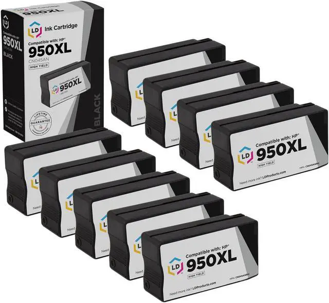 This product includes an LD Products Compatible Ink Cartridge Replacements for HP 950 xl HP 950xl Black Ink Cartridge Office Jet 251dw 276dw MFP 8100 8600 8610 8615 8616 8620 8625 8630 (HP950XL Black, 9-Pack). Our printer supplies are good for home, office or when you're running a business. Our products are put through a rigorous testing process where they are monitored for quality and reliability. Please note, retail packaging may vary and will only work with printers purchased within the United States and Canada.