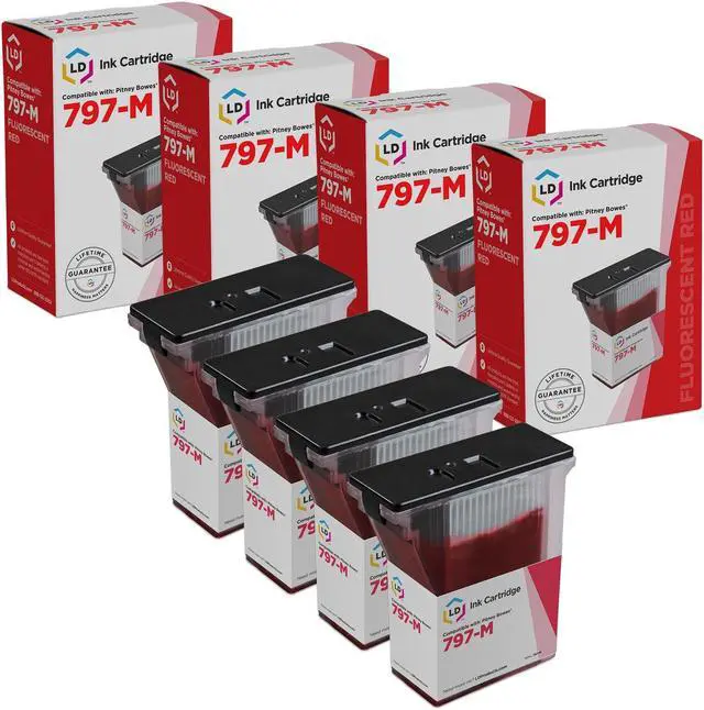 Save even more with our pack of 4 compatible inkjet cartridges. This set includes 4 797-M Fluorescent Red inkjet cartridges. Why pay more for brand name Pitney Bowes MailStation 2 K7M0 ink cartridges? This combo set works with Pitney Bowes MailStation K7M0 and K7M0 Mail. We are the exclusive reseller of LD Products brand of high quality printing supplies.