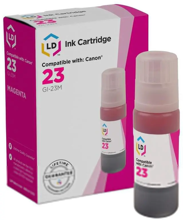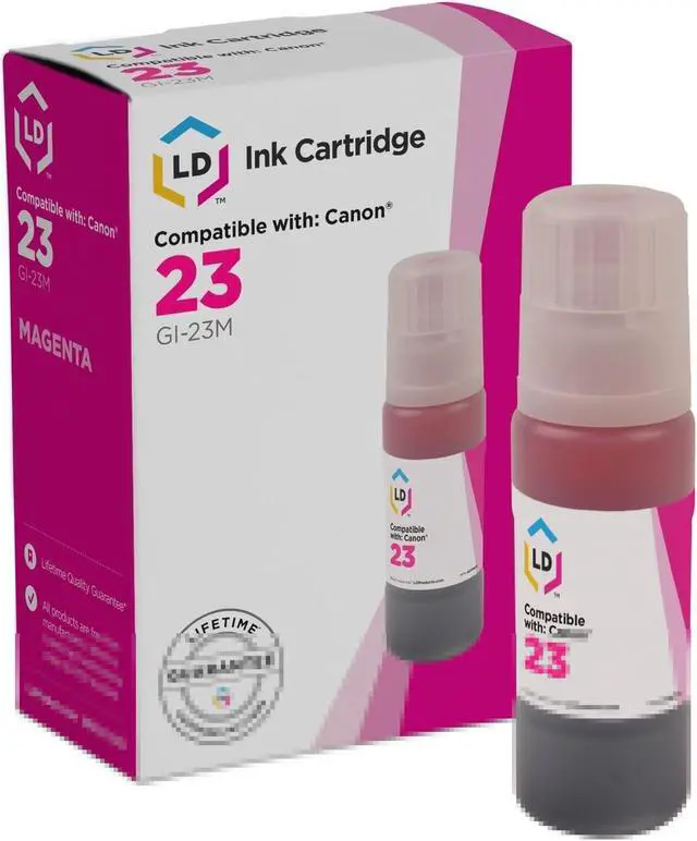Save and print even more when you shop with LD Products! This offer includes 1 compatible replacement for Canon GI-23 magenta ink bottle. Why pay twice as much for expensive brand name ink when our quality replacement printer supplies are backed by a 100% satisfaction and lifetime guarantee? For use in Canon Pixma G520 and PIXMA G620 photo printers. Please note, retail packaging may vary, and these bottles will only work with printers purchased within the United States and Canada. The use of replacement ink bottles and supplies does not void your printer’s warranty.