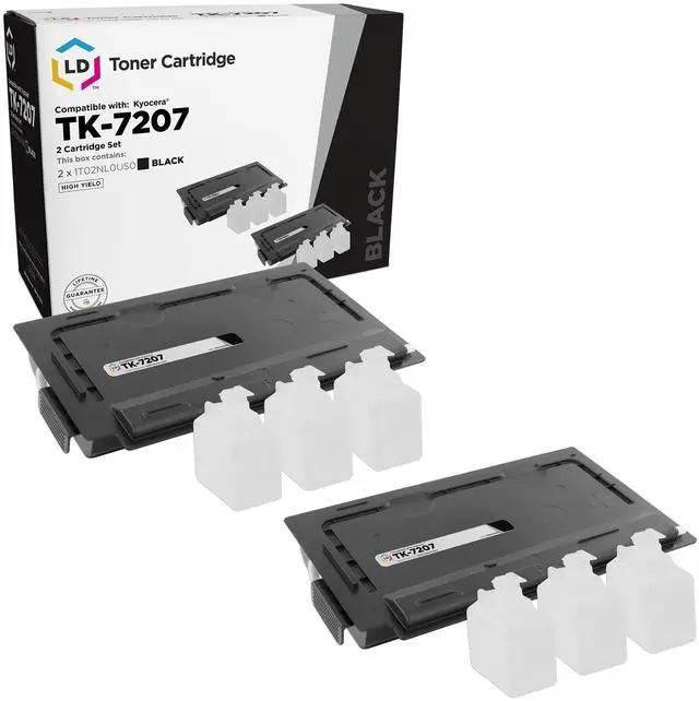 Save even more with our compatible toner cartridges. This listing contains 2 1T02NL0US0 black cartridges. Why pay twice as much for brand name Kyocera-Mita TK-7207 Cartridge when our compatible printer supplies deliver excellent quality for a fraction of the price? Our compatible cartridges for Kyocera-Mita are backed by a full 2 years 100% satisfaction guarantee. So stock up now and save even more! This set works in the following
