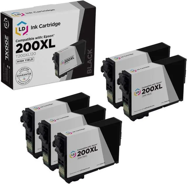 Save and print even more with our replacement for Epson 200 ink cartridges. This offer includes 5 remanufactured replacements for Epson 200 black ink cartridge. Why pay more for expensive brand name Epson expression ink when our replacements are built to perform? Compatible with Epson XP-200, XP-300, XP-310, XP-400, XP-410, WF-2520, WF-2530, WF-2540, WF-2520, WF-2530, WF-2540, XP-300, XP-310, XP-400 printers. Please note, retail packaging may vary, and these cartridges will only work with printers purchased within the United States and Canada.