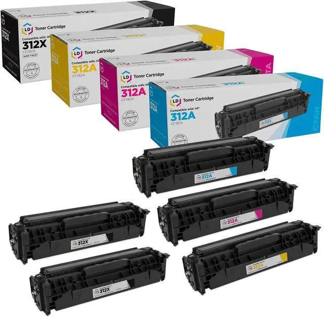 Save and print even more when you shop with LD Products! This offer includes 2 HP 312X Black / CF380X High Yield Black, 1 HP 312A Cyan / CF381A Cyan, 1 HP CF312A Magenta / CF383A Magenta and 1 HP CF312A Yellow / CF382A Yellow laser toner cartridges. Why pay more for expensive brand name HP toner when our remanufactured replacement printer supplies are built to perform? Compatible with