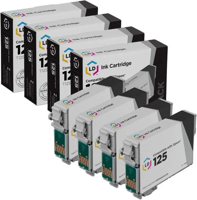 Save even more with our 4 Standard Yield T125120 ink cartridge set for the Epson T125 series. This set includes 4 Black T125120 ink cartridges. Why pay more for brand name Epson T125 black and color printer ink cartridges when our remanufactured printer supplies deliver excellent quality results for a fraction of the price? Then the Epson T125120 was filled with the same ink formula, the internal back pressure was insured and then it was inspected for any possible shell leakage, tested the operation of all electrical circuitry and finally run through an actual print test.