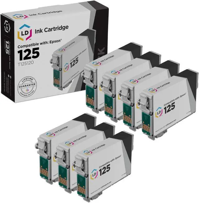 Save even more with our 7 Standard Yield T125120 ink cartridge set for the Epson T125 series. This set includes 7 Black T125120 ink cartridges. Why pay more for brand name Epson T125 black and color printer ink cartridges when our remanufactured printer supplies deliver excellent quality results for a fraction of the price? Then the Epson T125120 was filled with the same ink formula, the internal back pressure was insured and then it was inspected for any possible shell leakage, tested the operation of all electrical circuitry and finally run through an actual print test.