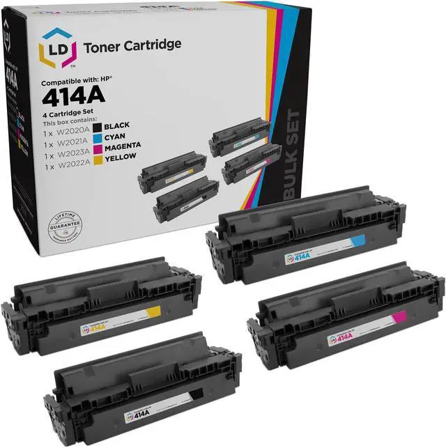 Save and print even more when you shop with LD Products! This offer includes 1 W2020A / HP 414A black, 1 W2021A / HP 414A cyan, 1 W2023A / HP 414A magenta and 1 W2022A / HP 414A yellow laser toner cartridges. Why pay more for expensive brand name HP toner Compatible with HP Color LaserJet M454dn, HP Color LaserJet Pro M454dw, HP Color LaserJet Pro MFP M479dw, HP Color LaserJet Pro MFP M479fdn and HP Color LaserJet Pro MFP M479fdw. Please note, retail packaging may vary, and these cartridges will only work with printers purchased within the United States and Canada.