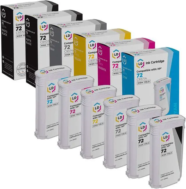 HP 72 ink cartridges: 1 C9370A Photo Black, 1 C9371A Cyan, 1 C9372A Magenta, 1 C9373A Yellow, 1 C9374A Gray, 1 C9403A Matte Black. Why pay more for expensive brand name HP 72 Ink? Compatible with DesignJet T1100, T1120, T1200, T610, T620, T770, SD Pro MFP, T1100ps, T1120 SD-MFP, T1120ps, T1200ps, T1300, T2300, T2300ps, T790, T795 printers.. Our cartridges are good for home, office or when you're running a business. Our products are put through a rigorous testing process where they are monitored for quality and reliability. Knowing the ink cartridge that works most efficiently with your printer model is important. Please note, retail packaging may vary and these cartridges will only work with printers purchased within the United States and Canada. The use of compatible cartridges does not void your printers warranty and our cartridges are not manufactured by HP. We are the exclusive reseller of LD Products brand of high-quality printing supplies.