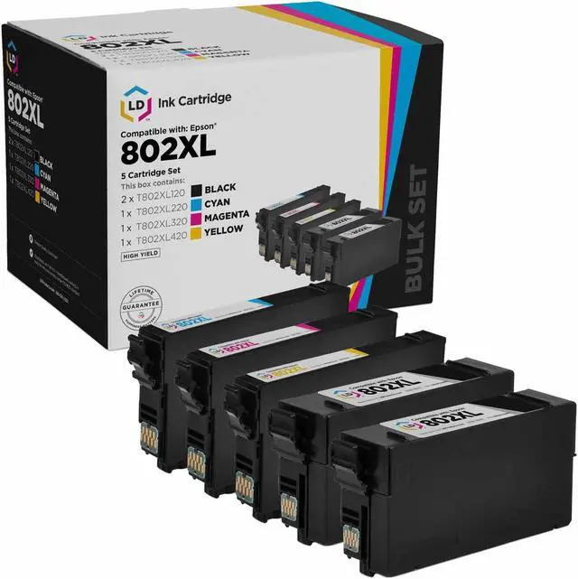 Save and print even more when you shop with LD Products! This offer includes the following high yield remanufactured replacements: 2 Epson 802 / 802XL black, 1 Epson ink 802 / 802XL cyan, 1 802XL magenta / 802 ink cartridge, and 1 802xl / T802XL420 yellow ink cartridge. Why pay more for expensive brand name Epson 802xl ink cartridges? Compatible with Epson WF Series WF-4720, WF-4730, WF-4734, WF-4740, WF-4740DWF | Epson WorkForce WF-4720, WF-4730, WF-4734, WF-4740, and Epson WorkForce Pro WF-4720, WF-4730, WF-4734, WF-4740, WF-4740DWF inkjet printers. Please note, retail packaging may vary, and these cartridges will only work with printers purchased within the United States and Canada. The use of replacement ink and toner cartridges and supplies does not void your printers warranty. Professionally remanufactured by LD Products. Epson is a registered trademark of SEIKO EPSON KABUSHIKI KAISHA Corporation and is not affiliated with and does not endorse LD Products.