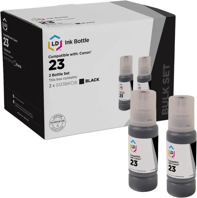 Save and print even more when you shop with LD Products! This offer includes 2 compatible replacements for Canon GI-23 black ink bottles. Why pay more for expensive brand name ink? For use in Canon G520 and G620 photo printers. Please note, retail packaging may vary, and these bottles will only work with printers purchased within the United States and Canada. The use of replacement ink bottles and supplies does not void your printers warranty. Professionally manufactured by LD Products.