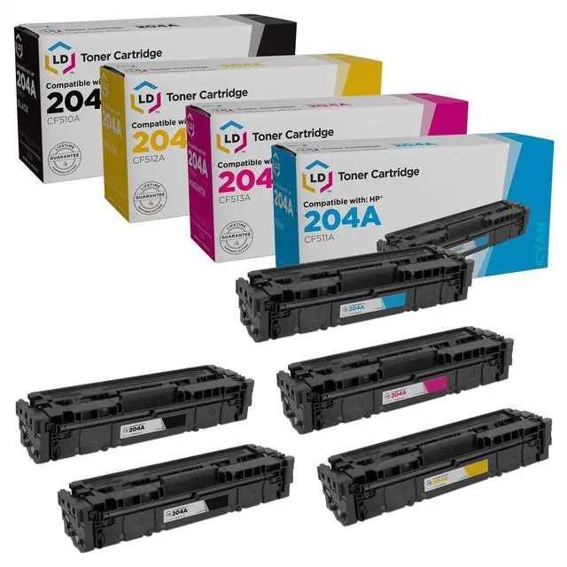 This offer includes (2) CF510A black, (1) CF511A cyan, (1) CF513A magenta and (1) CF512A yellow laser toner cartridges; they replace the original HP 204A toner series. This toner cartridge set is compatible with HP Color LaserJet M180nw printers. Please note, retail packaging may vary and these cartridges will only work with printers purchased within the United States and Canada. The use of compatible replacement printing supplies does not void your printer warranty. HP does not manufacture our compatible toner cartridges. We are the exclusive reseller of LD Products brand of high quality printing supplies.