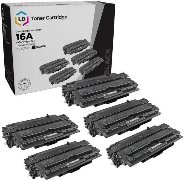 This set includes 5 Q7516A black laser toner cartridges. Our remanufactured ink cartridges are not remanufactured by HP. This set works in the following