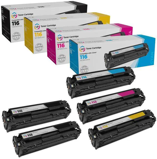 This listing contains (2) 1980B001AA / 116, black, (1) 1979B001AA / 116 cyan, (1) 1978B001AA / 116 magenta and (1) 1977B001AA / 116 yellow toner cartridges. This set is compatible with Canon ImageCLASS MF8050Cn, MF8080Cw and Canon LBP-5050 printers. Please note, retail packaging may vary and these cartridges will only work with printers purchased within the United States and Canada. The use of remanufactured printing supplies does not void your printers warranty. We are the exclusive reseller of LD Products brand of high quality printing supplies.