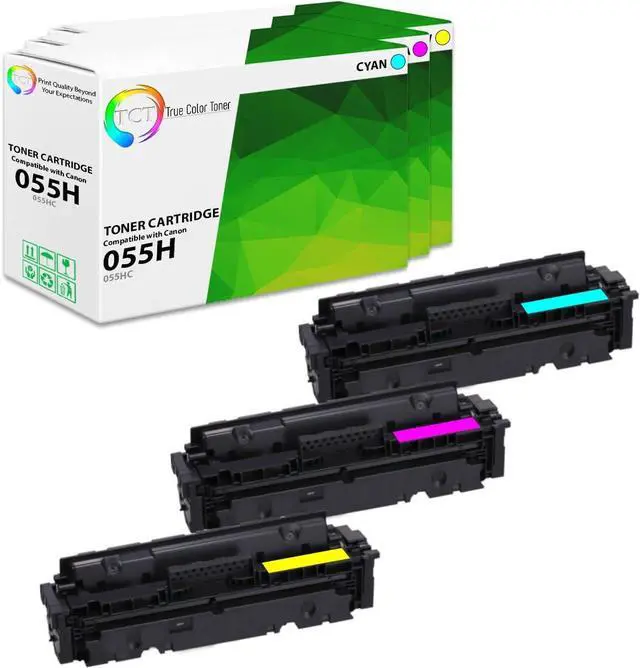 Package Contains the Following TCT Compatible Replacement Toner Cartridges: 1 × 3019C001 Cyan, 1 × 3018C001 Magenta, 1 × 3017C001 Yellow for the Canon 055H Series