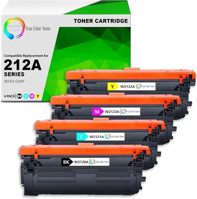 PACKAGE INCLUDES: Four compatible replacement toner cartridges - 1 × W2120A Black, 1 × W2121A Cyan, 1 × W2122A Yellow, 1 × W2123A Magenta for HP 212A printers.