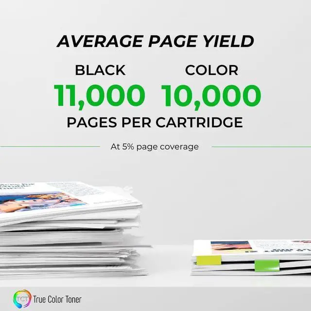 Page Yield: Up to 11000 pages per Black and 10000 per color cartridge at 5% coverage (Letter/A4).