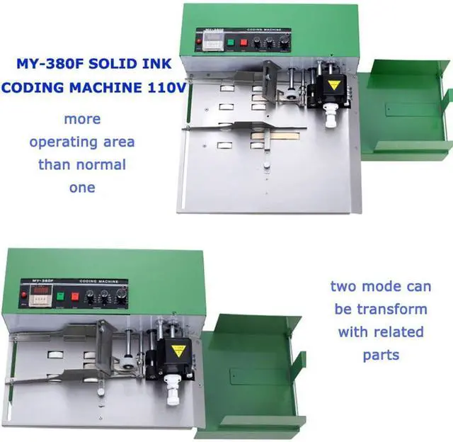 MY-380F solid-ink coding machine fit for printing label on paper, thin cardboard, plastic film and aluminum foil. Adopt solid-ink coding, characterized by high definition, instant printing & instant dry, various colors selectable and strong adhesion.