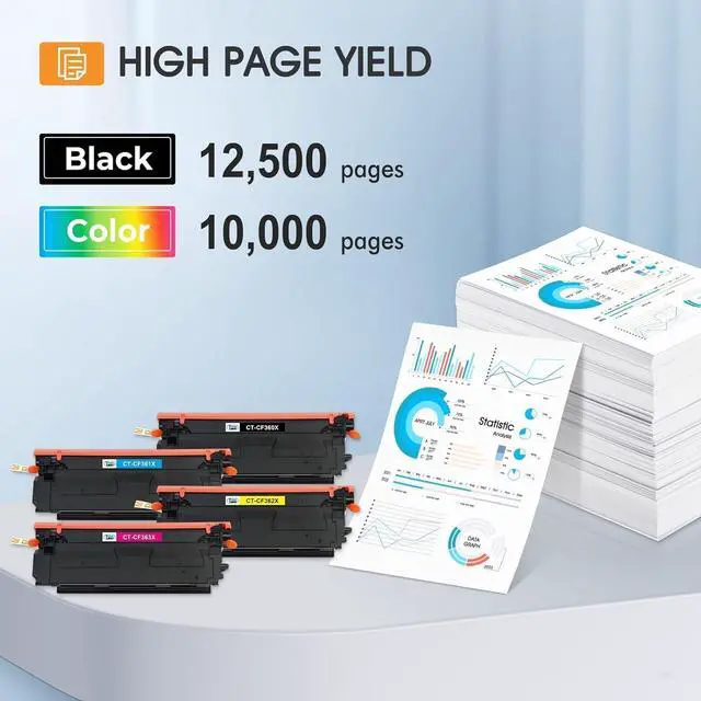 Page Yield: 1,2500 pages for 508X black toner cartridge and 9,500 pages for per 508X color toner cartridge based on 5% coverage (Letter/A4)