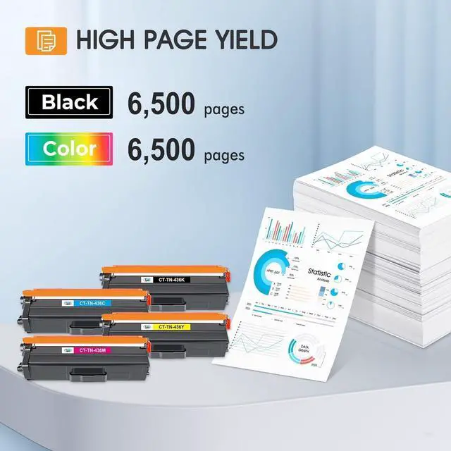 High Page Yield: Up to 6,500 pages per TN436BK toner cartridge (Letter A4, at 5% Coverage), Up to 6,500 pages per TN436C TN436M TN436Y toner cartridge (Letter A4, at 5% Coverage)