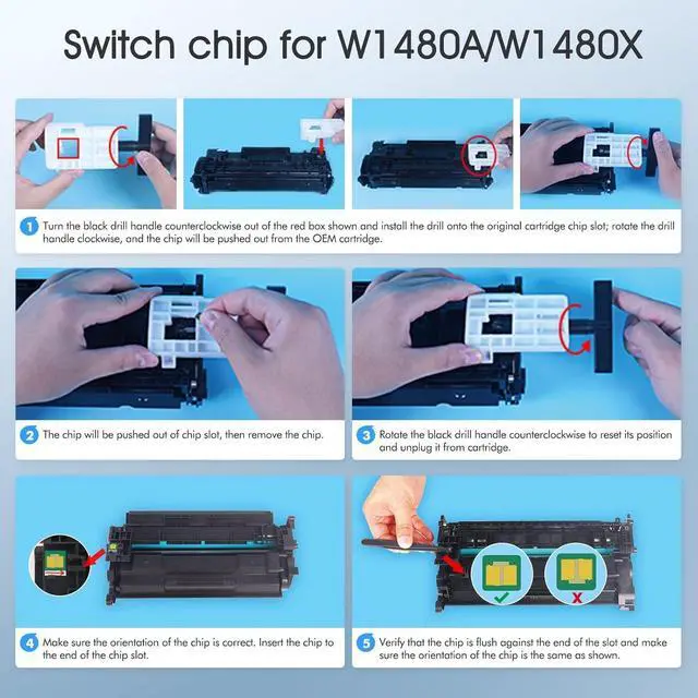 No Chip: These 148A W1480A toner cartridges do not have chips, and need to transfer chip from 148A toner. Please follow user instructions and use the tools provided to complete the chip