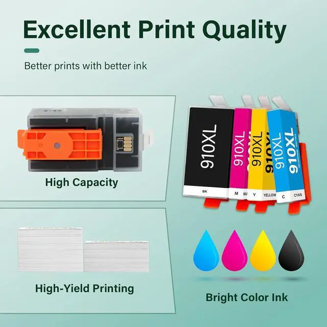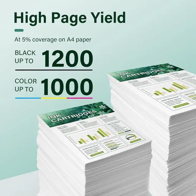High Page Yield: Up to 1,200 pages for each 910XL Black Ink1000pages for each 910XL Color Ink at 5% coverage (A4/letter)