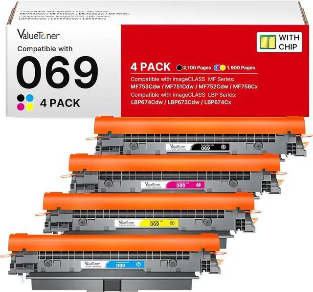 With Chip: Valuetoner 069 canon toner with chip inside and to use with canon 069 toner and canon 069h toner cartridge set.Vauletoner delivers exceptional print quality and reliability, ensures sharp, smudge-free text and vibrant printout. The durable construction prevents leaks and jams, ensuring smooth operation.