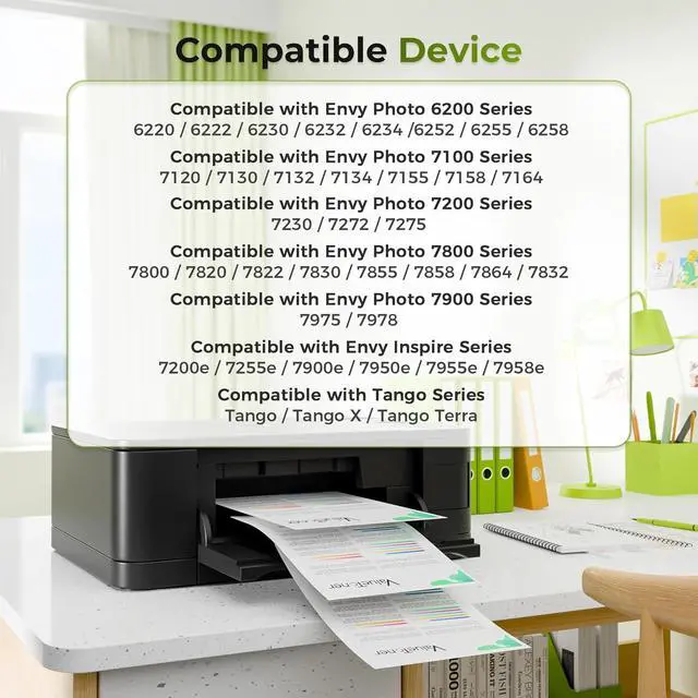 Compatible Printers: 64xl black and color ink cartridge for hp printers Envy Photo [6200 Series] 6220, 6222, 6230, 6232, 6234, 6252, 6255, 6258 [7100 Series] 7120, 7130, 7132, 7134, 7155, 7158, 7164 [7200 Series] 7230, 7272, 7275 [7800 Series] 7820, 7822, 7830, 7855, 7858, 7864, 7832 [ENVY Inspire Series] 7200e, 7255e, 7900e,7950e, 7955e, 7958e [7900 Series]7975 / 7978 [Tango Series]Tango / Tango X / Tango Terra