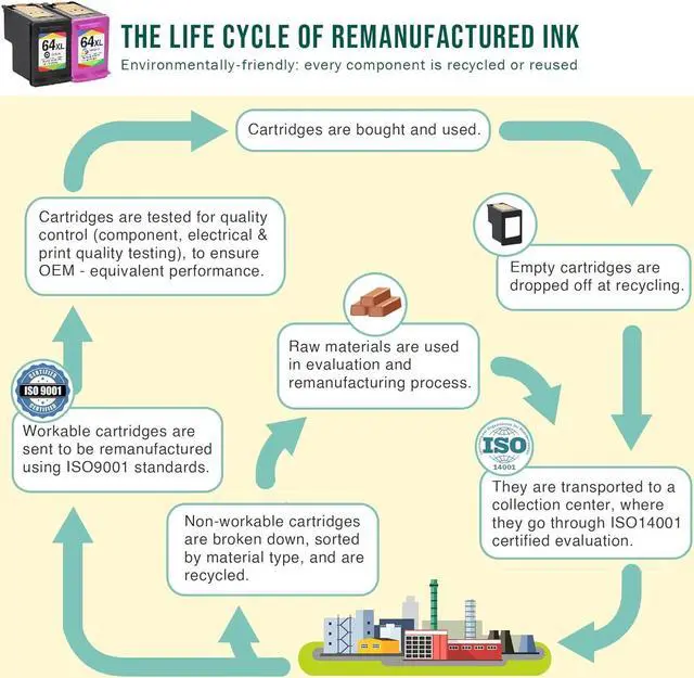 All cartridges go through a rigorous quality control procedure and undergo testing at the component level, testing for electrical circuitry, printhead cleaning, filling to capacity, and a final print test.