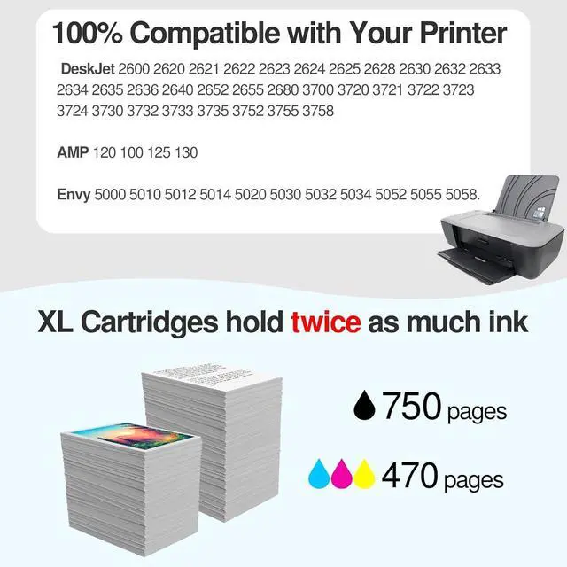 For HP 65 xl compatible printers: Envy 5055 5000 5010 5012 5014 5020 5030 5032 5034 5052 5058. DeskJet 2600 2620 2621 2622 2623 2624 2625 2628 2630 2632 2633 2634 2635 2636 2640 2652 2655 2680 3700 3720 3721 3722 3723 3724 3730 3732 3733 3735 3752 3755 3758, AMP 120 100 125 130. These Remanufactured for HP Envy 5055 ink cartridges are compatible with all new printers.
