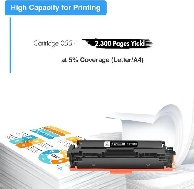 Page Yield: 2,300 pages for Canon 055 toner cartridge black (Letter/A4, at 5% Coverage)