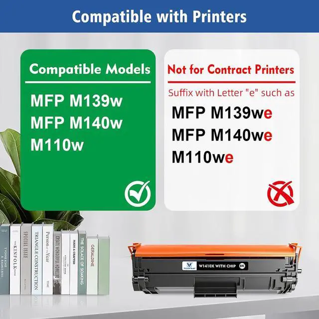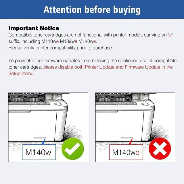 1.Important Notice: Compatible toner cartridges are not functional with printer models carrying an "e" suffix, including M110we M139we M140we. Please verify printer compatibility prior to purchase. To prevent future firmware updates from blocking the continued use of compatible toner cartridges, please disable both Printer Update and Firmware Update in the Setup menu.