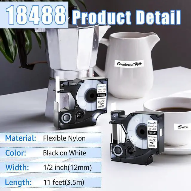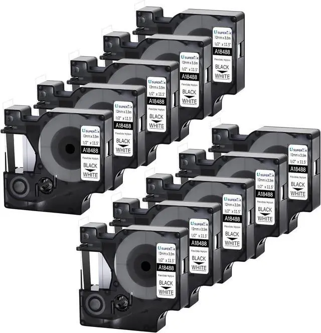 USUPERINK Alternative Replacement Compatible for Dymo 18488 Rhino Industrial Flexible Nylon Adhesive Label Maker Tapes; Color: Black Text on White Tape, Length:3.5m(11.5 feet), Width: 12mm(1/2 inch)