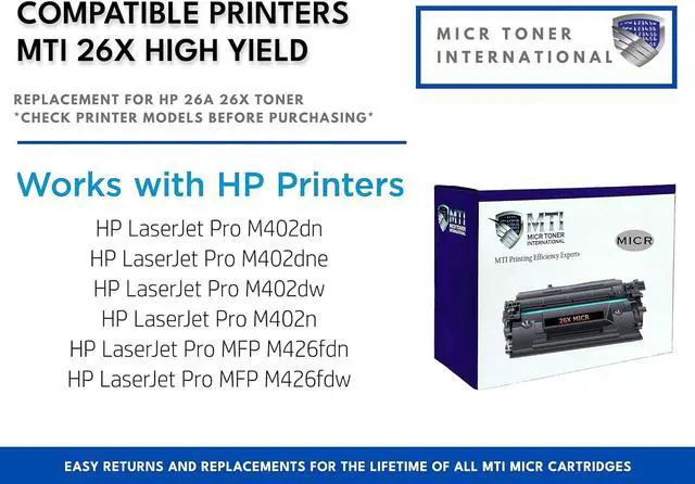 1 MTI Compatible HP 26X 26A High Yield MICR Ink Cartridge with superior magnetic ink for guaranteed bank acceptance and true image printing