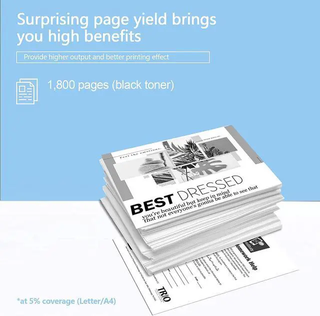 High capacity provides more pages to be printed. Approx 1,800 pages per toner cartridge at 5% coverage (Letter/A4)