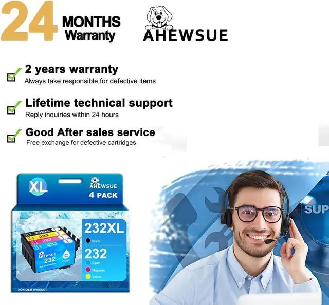 2 YEARS WARRANTY and LIFETIME TECHNICAL SUPPORT for EPSON 232XL ink cartridges . 100% guaranteeing compatible and easy install . 100% Satisfaction for FREE EXCHANGE for defective 232XL ink cartridges combo pack! Should you need support for your orders, contact us anytime.