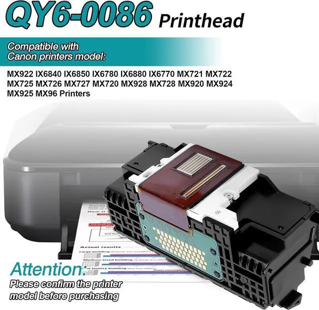 • Compatible Models: QY6-0086 printhead is compatible with Canon IX6840 IX6850 IX6780 IX6880 IX6770 IX6810 IX6820 MX721 MX722 MX725 MX726 MX727 MX720 MX922 MX928 MX728 MX920 MX924 MX925 MX96 printers