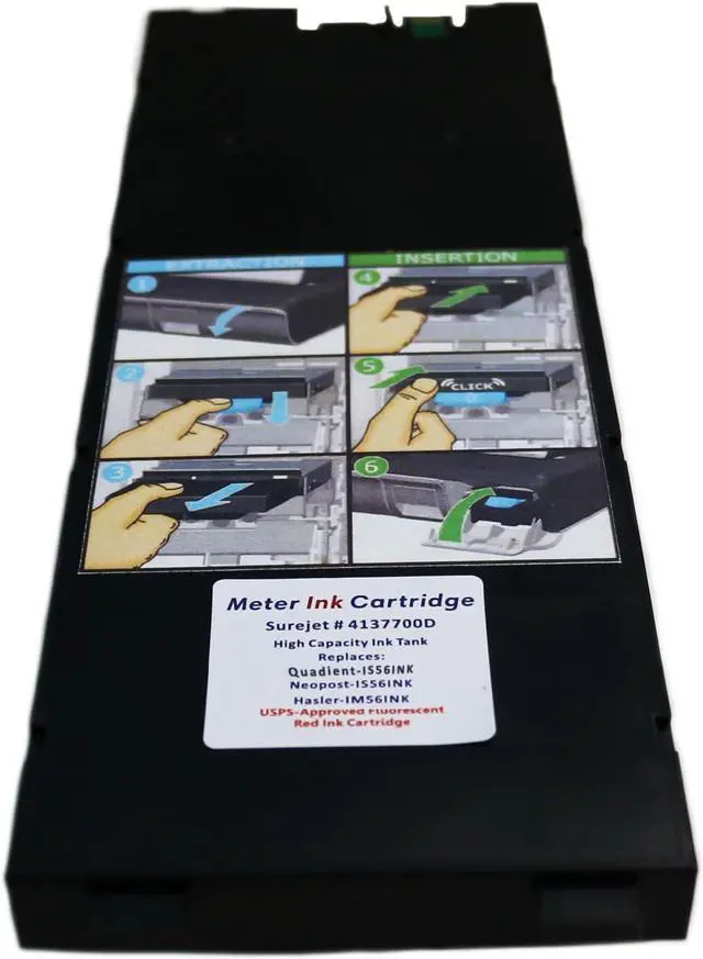 This non-OEM product is compatible with IS56INK / sure.jet # 4137700D red fluorescent ink tank. This compatible ink tank is for use in IS5000/IS6000 mailing machines. One tank will provide up to 100,000 imprints.
