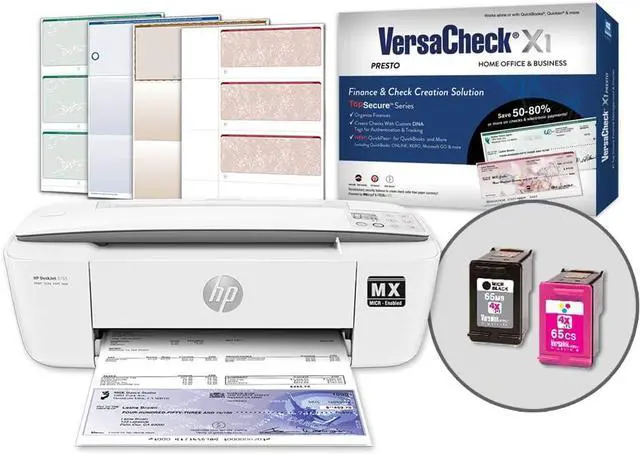Includes : HP 3755 MXE All-in-One Check Printer, 1 VersaInk-nano HP 65 MS - Black MICR Cartridge, 1 VersaInk-nano HP 65 CS Color Ink Cartridge, VersaCheck Presto Software (Download), 1 VersaCheck Check Paper Starter Pack