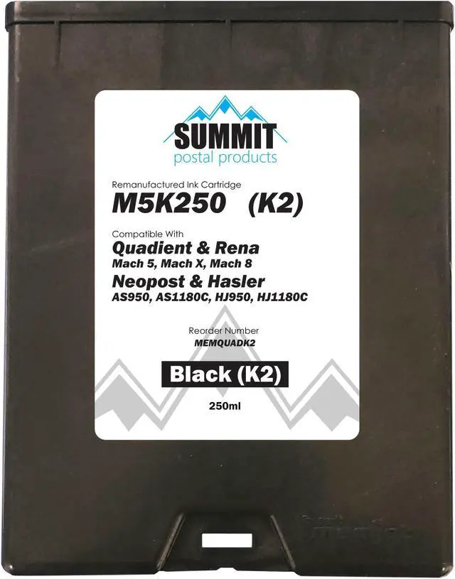 Print vibrant full color envelopes with our high capacity, 250 ml Quadient compatible ink cartridges. Plug and Play compatibility offers ease of use and carefree operation. Compatible with Quadient Mach 5, Quadient Mach 8, Quadient Mach X, Neopost AS950C, Neopost AS1180C, Hasler HJ950C, Hasler HJ1180C, Rena Mach 5, Rena Mach 8, Rena Mach X envelope printers. All Summit Postal Products ink cartridges are covered by our exclusive 100% Customer Satisfaction Guarantee, ensuring your complete satisfaction with the product. This product is remanufactured in the USA and is not an OEM product.