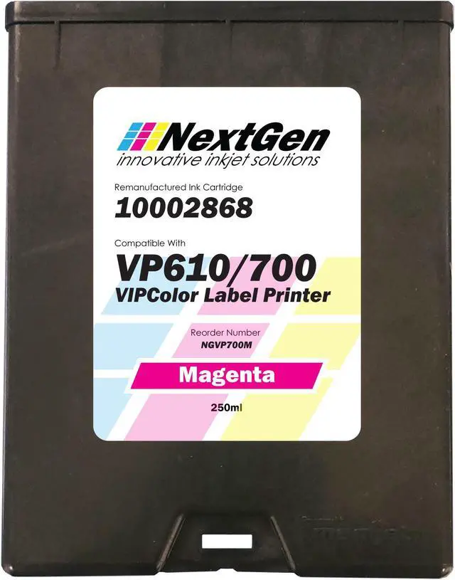 The VIPColor VP610 / VP700 Compatible Magenta Ink Cartridge is designed for use in VP610 and VP700 envelope printers. It replaces the VIPColor Magenta (Part Number 10002868) cartridge and contains 250 ml of 100% VIPColor compliant Magenta dye-based ink. With vibrant colors and outstanding print quality, it ensures professional-looking envelopes for your printing and mailing operation. The cartridge offers plug & play compatibility, allowing for easy installation and use. Summit Postal Products compatible ink cartridges deliver excellent reliability & performance.