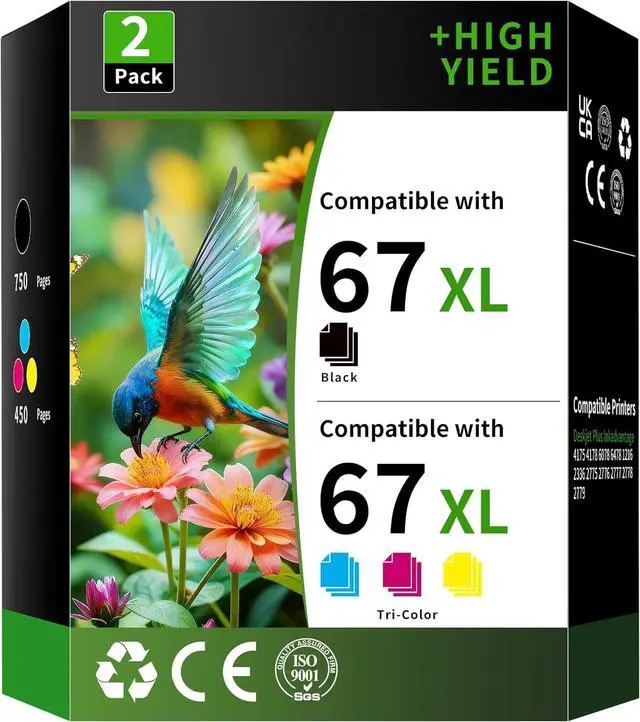 Package Contents: 2 Pack High Yield 67XL Ink Cartridge Compatible Replacement for HP67XL HP67 67 XL ( 1 Black +1 Tri-Color )