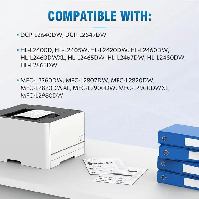 Printer Compatibility: Printer DCP-L2640DW, DCP-L2647DW, HL-L2400D, HL-L2405W, HL-L2420DW, HL-L2460DW, HL-L2460DWXL, HL-L2465DW, HL-L2467DW, HL-L2480DW, HL-L2865DW, MFC-L2760DW, MFC-L2807DW, MFC-L2820DW, MFC-L2820DWXL, MFC-L2900DW, MFC-L2900DWXL, MFC-L2980DW Series