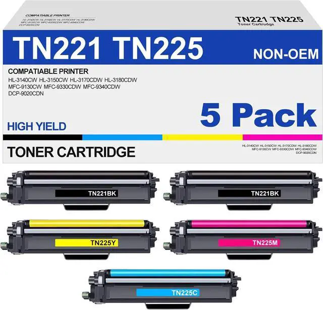Packing List: 2 x TN221 Black, 1 x TN225 Cyan, 1 x TN225 Magenta, 1 x TN225 Yellow (Total 5 Pack).