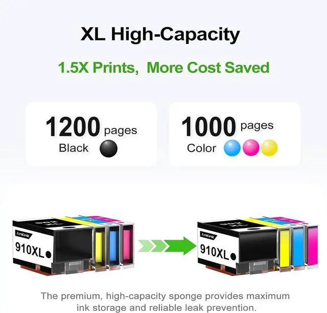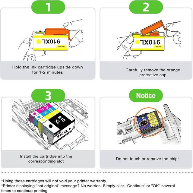 PACKAGE CONTENTS: Receive four (4) High Yield 910XL Ink Cartridges (1 Black, 1 Cyan, 1 Magenta, 1 Yellow) and a User Installation Guide