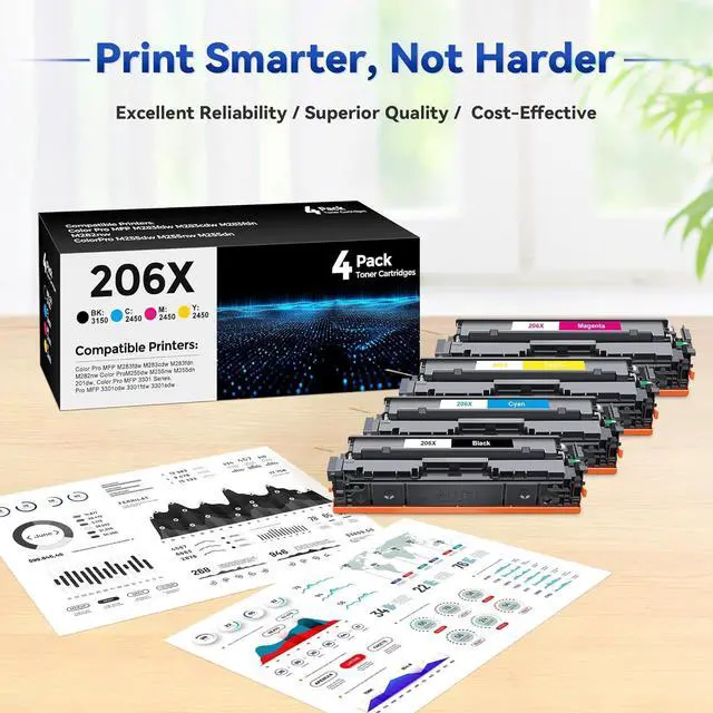 Package Included:206x toner cartridges 4 pack high yield, 1 x 206X black toner cartridge,1 x 206X cyan toner cartridge,1 x 206X yellow toner cartridge, 1 x 206X magenta toner cartridge. Color:Black/Cyan/Yellow/Magenta