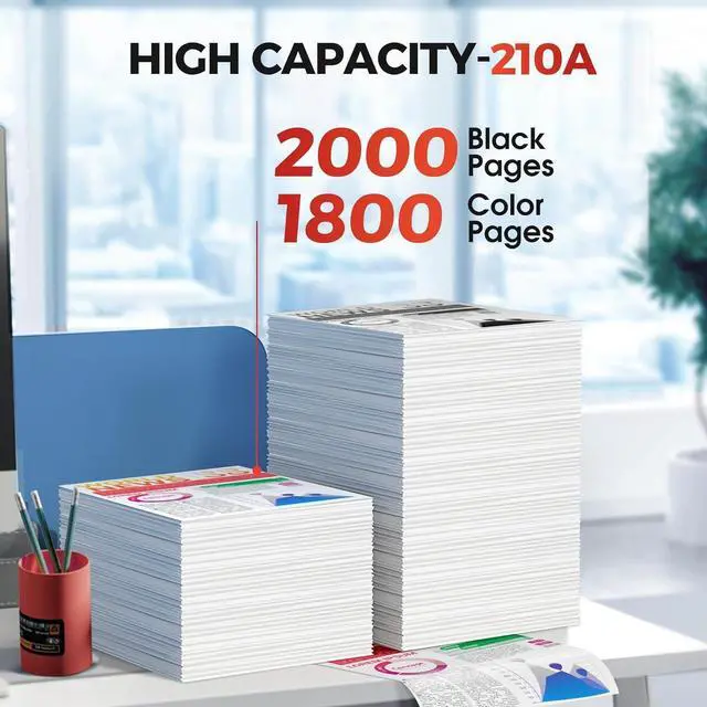 High Page Yield: up to 2,000 pages per 210A black toner cartridge W2100A, up to 1,800 pages per for HP 210a toner cartridges color W2101A W2102A W2103A (C/Y/M) at 5% coverage, work for hp 210a toner cartridges 4 pack