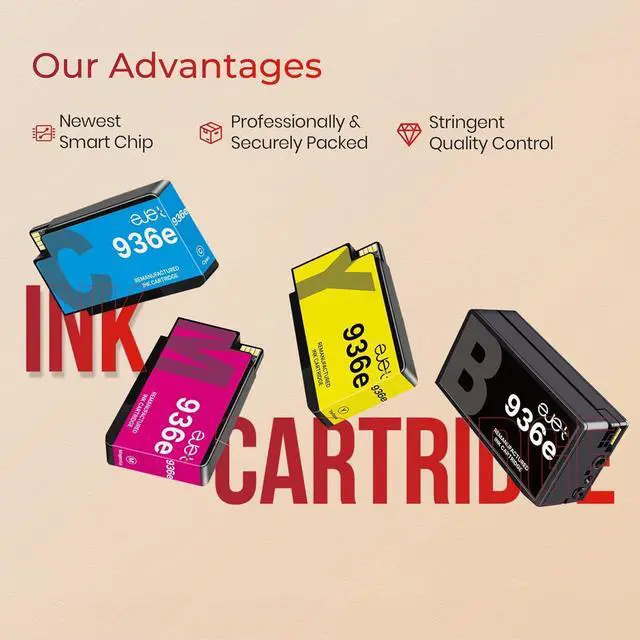[Package Content]: 4 Pack ejet for HP 936e ink cartridges (1 × 936e black, 1 × 936e cyan, 1 × 936e magenta, 1 × 936e yellow ink cartridge)